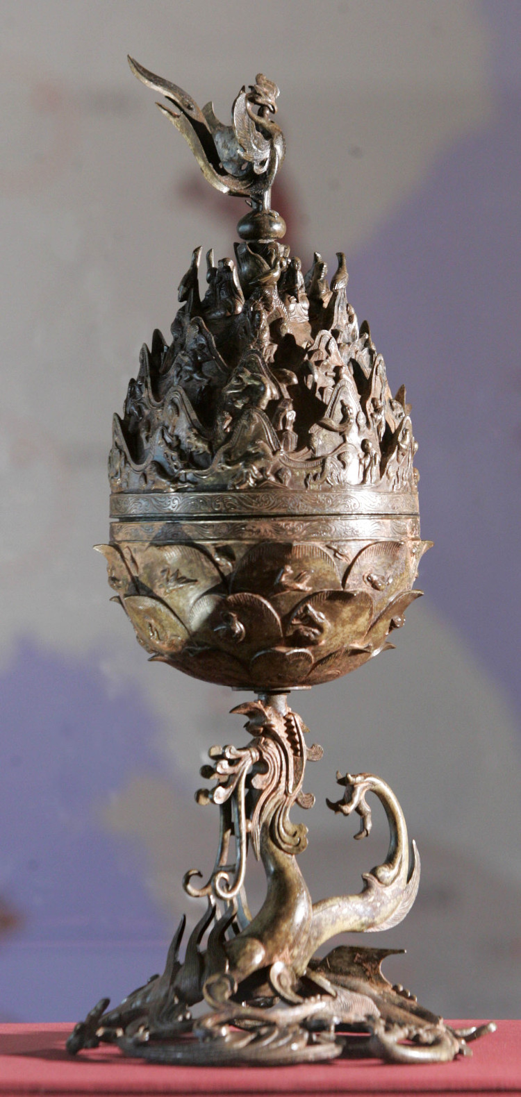 답=그렇습니다. 향로는 뚜껑과 몸체 두 부분으로 구분돼 있었구요, 뚜껑 꼭지에는 봉황인 듯 같은 새 한 마리가 턱 밑에 여의주를 안고 날개를 활짝 펴고 날고 있었습니다.