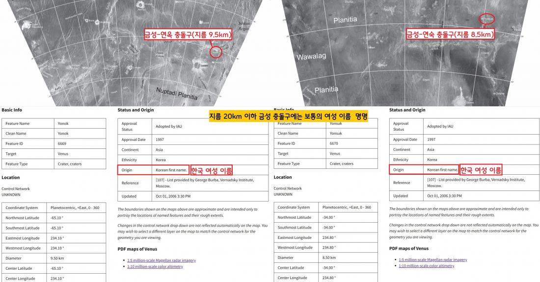 금성 충돌구의 경우 지름이 20km 이하의 충돌구 이름에는 각 나라의 일반적인 여성 이름을 붙인다. 그중 지름 9.5km, 8.5km인 충돌구에 한국의 보통 여성 이름인 ‘연숙’과 ‘연옥’이 붙었다. |국제천문연맹 홈페이지