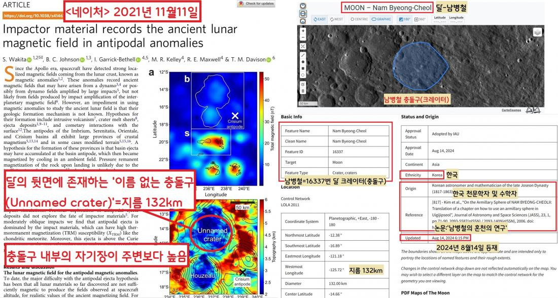 2021년 11월 국제학술지 <네이처>에 실린 ‘달 뒷면의 이름없는 충돌구. 경희대·미 산타크루즈대 공동연구팀과 고천문학자 양홍진 박사의 노력으로 8월14일 국제천문연맹의 달 충돌구 명단에 ‘남병철 충돌구’로 정식 등재됐다.|국제천문연맹 홈페이지