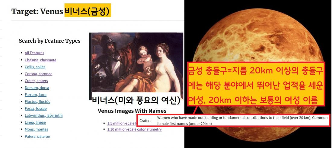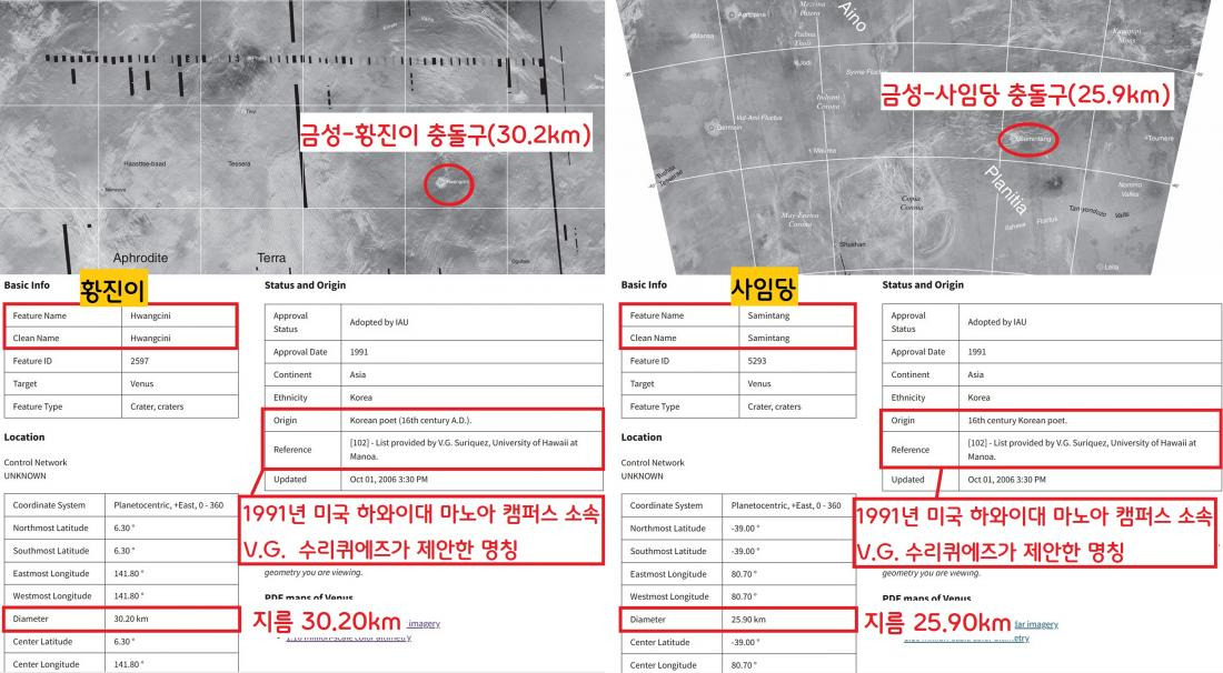 금성에는 한국의 황진이와 사임당 충돌구도 존재한다. 1991년 미국 하와이대 마노아 캠퍼스 소속 학자인 V.S. 수리퀴에즈가 제안한 이름으로 표기되어 있다.|국제천문연맹 홈페이지