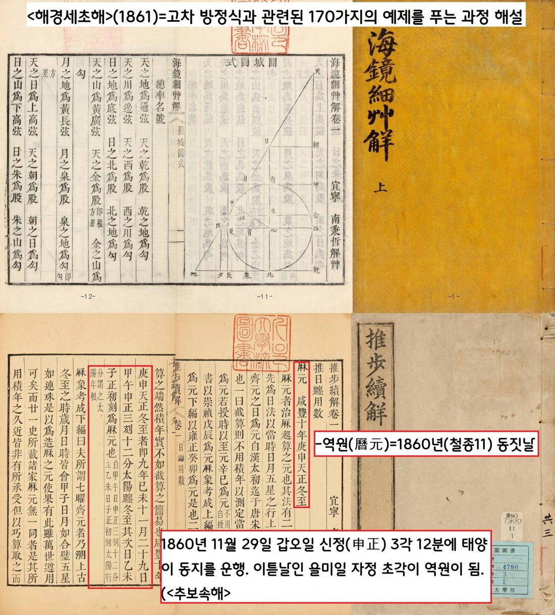 뛰어난 수학자의 면모는 각종 수학서 편찬에서 발현된다. <해경세초해>(1861)는 고차 방정식과 관련된 170가지의 예제를 만들어 푸는 과정을 해설했다.