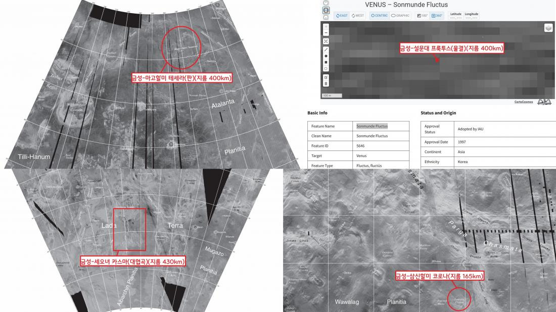 이유가 있다. 금성의 계곡 가운데 길이 400㎞ 이상 되는 곳은 세계 다양한 언어의 ‘금성’ 단어를 붙인다. 그래서 금성에서 확인된 길이 700㎞ 길이의 협곡에 ‘비너스’의 한국 이름인 ‘금성’을 붙였다. 이밖에 금성의 각 부분에 ‘마고할미 테세라(판)’, ‘설문대 할망 프룩투스(물결)’, ‘세오녀 카스마(대협곡)’, ‘삼신 할미 코로나’ 등 한국 설화에 등장하는 여성이 등장한다.