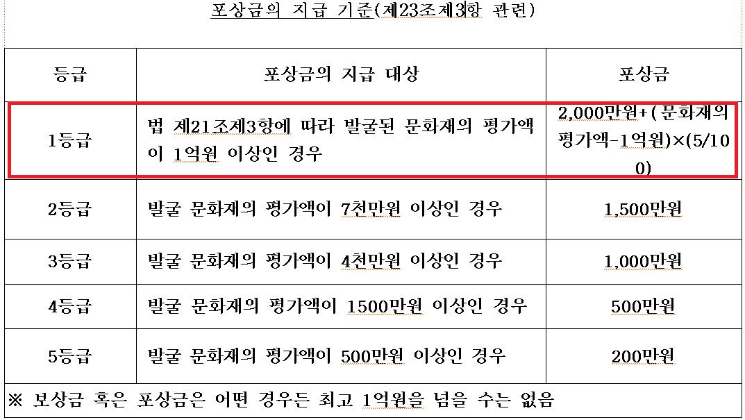 그렇다면 좀 억울하겠죠. 비록 ‘청자대접’ 1점이지만 이 청자대접을 계기로 고려청자를 가득실은 태안선을 찾아냈으니까요. 다행히 그런 법을 보완할 규정이 있습니다. 즉 ‘매장문화재 보호 및 조사에 관한 법률’(제21조)에 따라 ‘발굴의 원인을 제공한 자에게는 문화재의 가치와 규모를 고려해서 포상금을 지급할 수 있다’(3항)는 ‘포상 규정’입니다.
