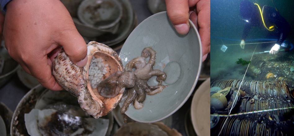 그런데 이 주꾸미는 청자접시로 입구를 막고 있었던거죠. 이를 계기로 본격발굴에 돌입했고, 2만5000여점의 유물이 든 ‘태안선’을 찾아냈습니다.