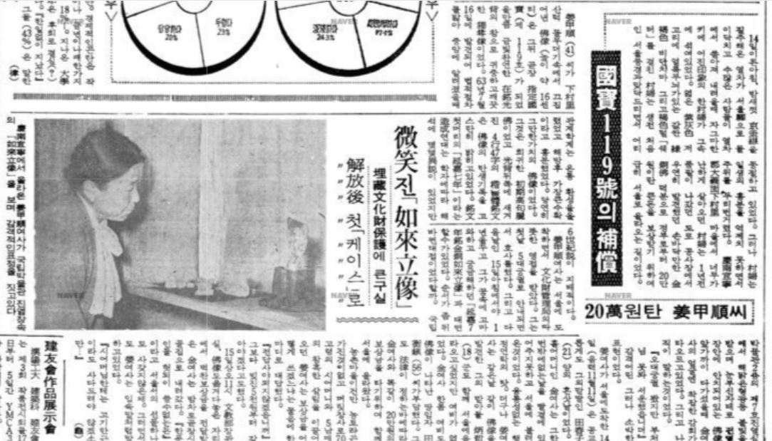 발견자인 강갑순씨는 인터뷰에서 “한푼도 헛되이 쓸 수는 없지만 그래도 시어머니에게 고기 한 근이라도 사다 드려야겠다”고 하면서도 “빚진 5000원을 갚고 나머지 돈으로 전답을 사야겠다”는 소감을 밝혔답니다. 또 여덟식구가 근근히 살다가 금동여래입상을 발견한 서울 삼양동 박용출씨는 120만원(현재 3300만원)의 보상금을 받았습니다. 불상의 가치는 240만원으로 평가됐지만 발견한 지점이 국유지여서 국가가 반(120만원), 박용출씨가 반(120만원)을 받게 된 거죠.