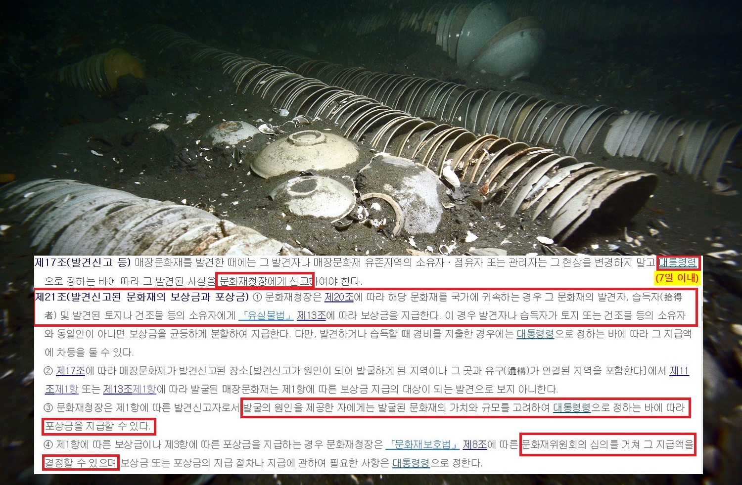 그렇다면 좀 억울하겠죠. 비록 ‘청자대접’ 1점이지만 이 청자대접을 계기로 고려청자를 가득실은 태안선을 찾아냈으니까요. 다행히 그런 법을 보완할 규정이 있습니다. 즉 ‘매장문화재 보호 및 조사에 관한 법률’(제21조)에 따라 ‘발굴의 원인을 제공한 자에게는 문화재의 가치와 규모를 고려해서 포상금을 지급할 수 있다’(3항)는 ‘포상 규정’입니다.