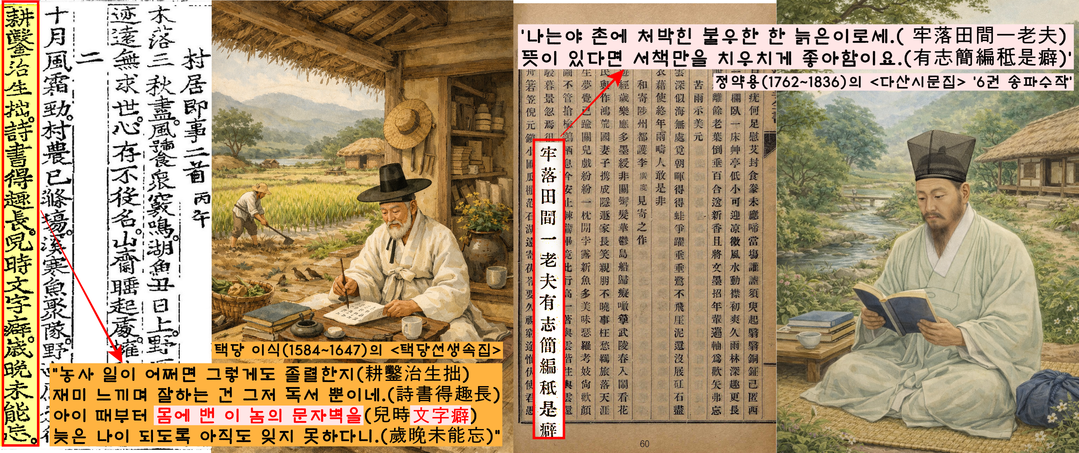 “농사로 먹고 사는 일 어쩌면 그리 졸렬한지 재미 느끼며 잘하는 건 그저 독서뿐 아이 때부터 몸에 밴 이놈의 문자벽(文字癖)을 늦은 나이 되도록 아직도 잊지 못하다니….”(<택당집>)