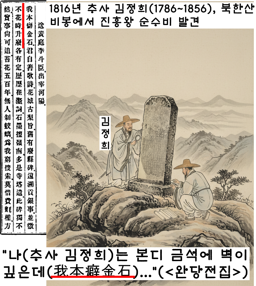 자랑할만했다. 추사는 최고의 금석학자라 할 수 있다. 그는 북한산 승가사 곁의 비봉에 서있던 비가 진흥왕순수비임을 밝혀낸다.(1816)