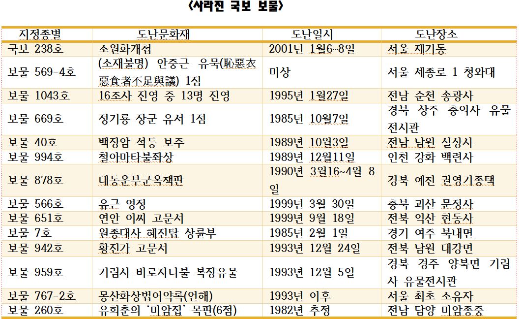 이뿐입니까. 1985년 2월 경기 여주 원종대사 혜진탑(보물 7호)의 상륜부 중 보륜과 보주 부분이 사라졌습니다. 지금까지 36년이 지나도록 찾지 못하고 있습니다. 또 경북 상주 정기룡 장군(1562~1622)의 유물 중 ‘유서’ 1점(보물 669호·1985년 도난), ‘남원 실상사 백장암 석등 보주’(보물 40호·1989년), ‘황진(1550~1593)가 고문서 2점’(보물 942호·1993년), ‘함양 박씨 정랑공파 문중전적-만국전도 1점’(보물 1008호·1993~4년), ‘익산 현등사 연안 이씨 종중 고문서’(보물 651호·1999년), ‘경주 기림사 비로자나불 복장유물’ 중 전적(보물 959-1호·1993년), ‘예천 대동운부군옥책판’(보물 878호·1990년), ‘강화 백련사 철아미타불좌상’(보물 994호·1989년), ‘유희춘 미암집목판’(보물 260호) 6점, ‘몽산화상법어약록(언해)(보물 767-2호) 등이 돌아오지 않는 보물입니다.