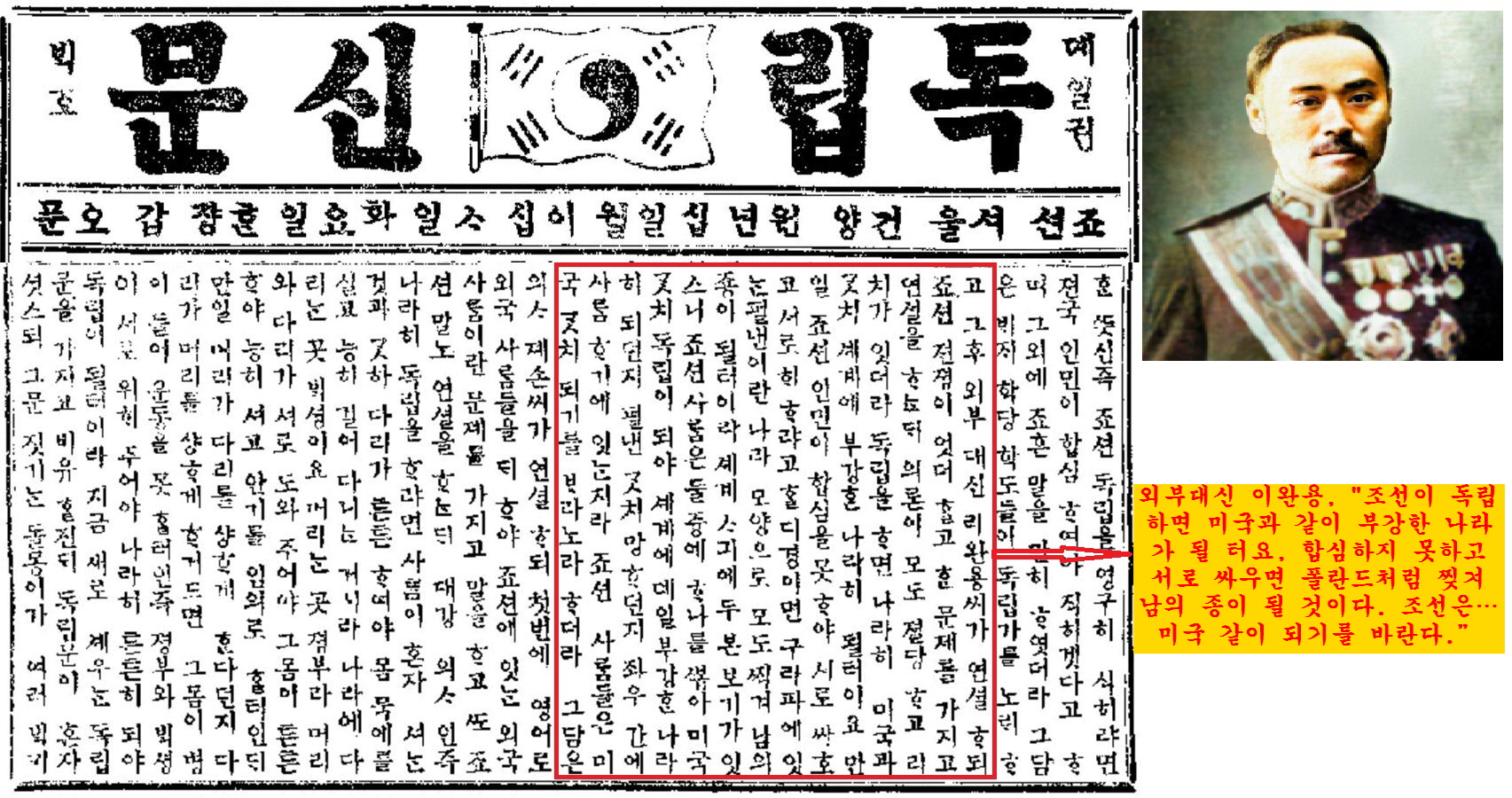 이완용이 이때까지 친미파였다는 사실을 알 수 있습니다. 그런 이완용이 14년 후 일제에 나라를 팔아먹은 친일파의 거두가 된거죠. 이완용이 선택한 길은 폴란드도, 미국도 아니고, 결국 일본이었던 겁니다.