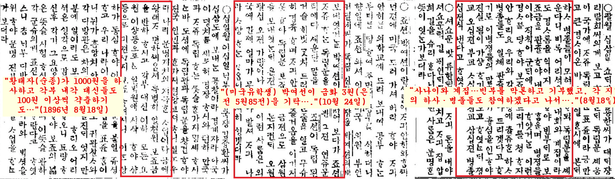 미국 유학 중이던 조선 사람이 독립문 건립소식을 이역만리에서 전해듣고는 금화 3원(은전 5원85전)을 기탁했다는 미담을 소개합니다.(10월24일) 독립문 건립의 열기가 이어지자 황태자(순종)가 1000원을 하사하고 각부 내각 대신들도 100원 이상씩 갹출하기도 했습니다.(12월 5일)