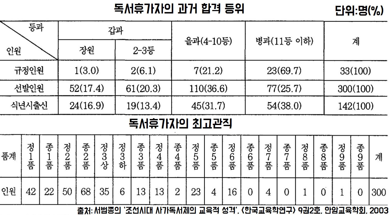 과거합격자 중 상위권인 갑과(2~3등)까지 포함하면 113명(37.7%)에 달했다. 아무래도 과거 성적이 좋은 이들이 독서휴가의 혜택을 더 받았다는 얘기다. 또한 300명 가운데 훗날 정3품 이상의 당상관에 오른 이가 217명(72.3%)에 이르렀다.