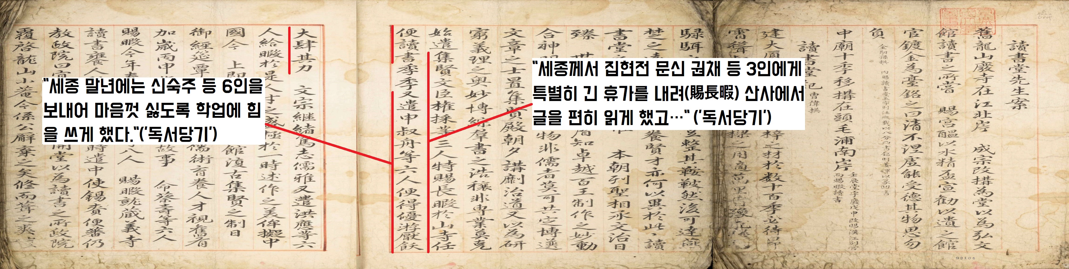 국왕과 세자에게 강의하는 업무는 물론이고 외교문서를 작성하고 사관·시험관·지제교(임금의 교서 작성)·사신 등의 역할까지 겸해야 했다. 세종은 그 때문에 촉망받는 집현전 관리들을 업무에서 해방시켜 ‘책만 읽으라’고 명한 것이다.