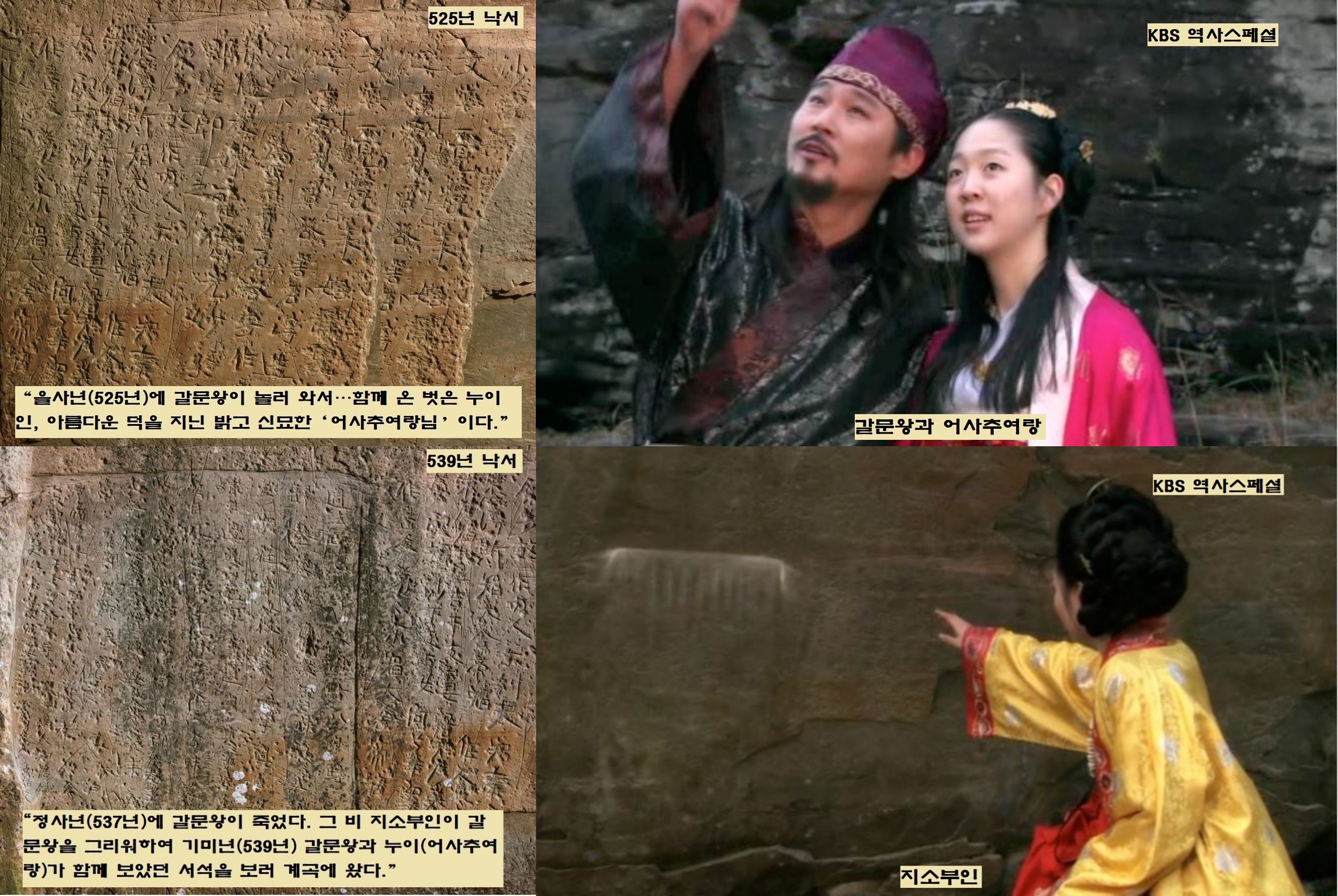 “정사년(537년)에 갈문왕이 죽었다. 그 비 지소부인이 갈문왕을 사랑하고 그리워하여 기미년(539년) 7월3일, 갈문왕과 누이(어사추여랑)가 함께 보았던 서석을 보러 계곡에 왔다. 무즉지태왕비 부걸지비(법흥왕비)와 사부지왕자(갈문왕의 아들·진흥왕)가 함께 왔다.”