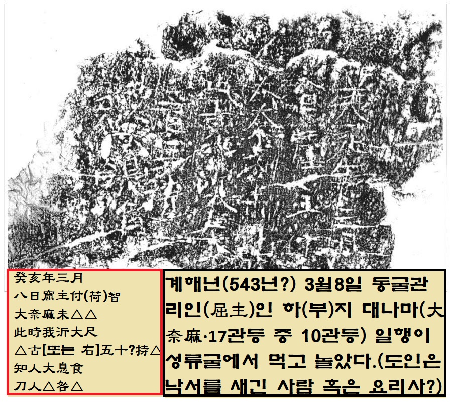 박홍국 관장의 ‘매의 눈’이 올린 개가였던 거죠. 본격 조사결과 명문은 39~40자(7행)로 구성되어 있었는데요. 대체로 ‘계해년에 대나마(17관등 중 10번째)이자 동굴관리자인 하지와 그 일행이 성류굴에 와서 쉬고 먹었던 사실을 기록한 낙서’로 이해할 수 있습니다. ‘계해년’은 어느 해일까요. 연구자들은 ‘대나마와 같이 ’대(大)’ 자가 앞에 붙는 관등은 법흥왕이 율령을 반포한 520년 즈음부터 시작됐을 거라고 봅니다. 또 신라의 경우 계해년처럼 간지를 쓰는 관행이 6~7세기까지이며, 이후에는 중국연호로 바뀌는데요. 따라서 낙서의 연대는 ‘543년(진흥왕 4) 계해년’일 가능성이 높은데요. 학계에서는 603년(진평왕 25), 663년(문무왕 3), 723년(성덕왕 22) 등도 거론하고 있습니다. 정확한 연대를 두고는 아직 설왕설래 중입니다.