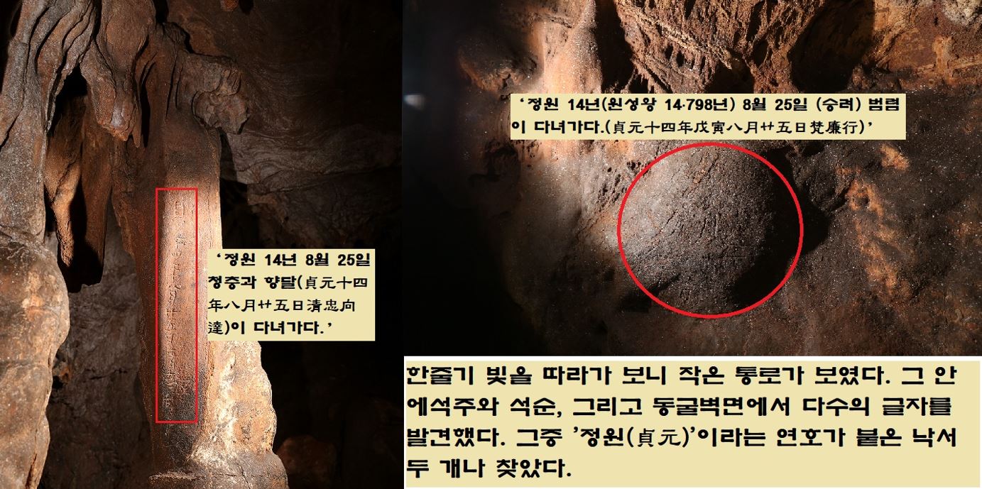 심현용 학예사가 소스라치게 놀랐습니다. 동굴 안 석주와 석순, 그리고 동굴벽면에서 다수의 글자를 발견한 겁니다. 두 사람은 바삐 글자를 판독하기 시작했습니다. 그중 ‘정원(貞元) 14년’이라는 명문 낙서 2개를 찾아냈습니다. 그것은 분명 연대를 알 수 있는 연호였습니다. 그 뿐이 아니었습니다. 벽면에서 화랑의 이름인 것 같은 ‘~랑(郞)’자가 여럿 보였습니다.