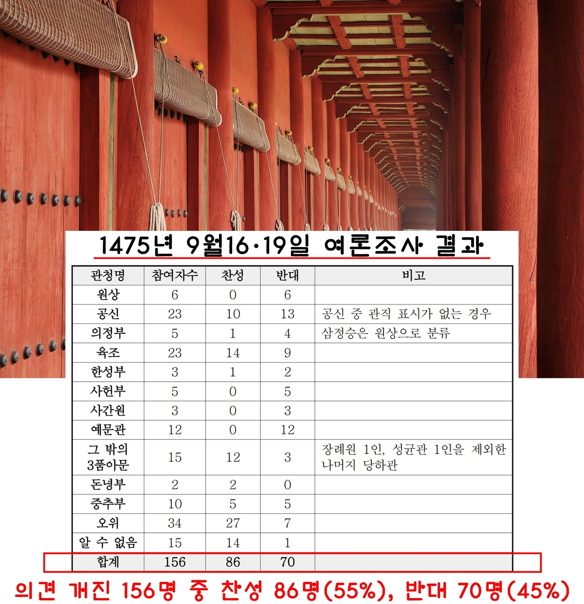 1475년(성종 6) 9월16일과 19일 두차례에 걸친 여론 조사 결과는 흥미로웠다. 의견을 낸 156명 가운데 찬성 86명, 반대 70명으로 집계됐다.