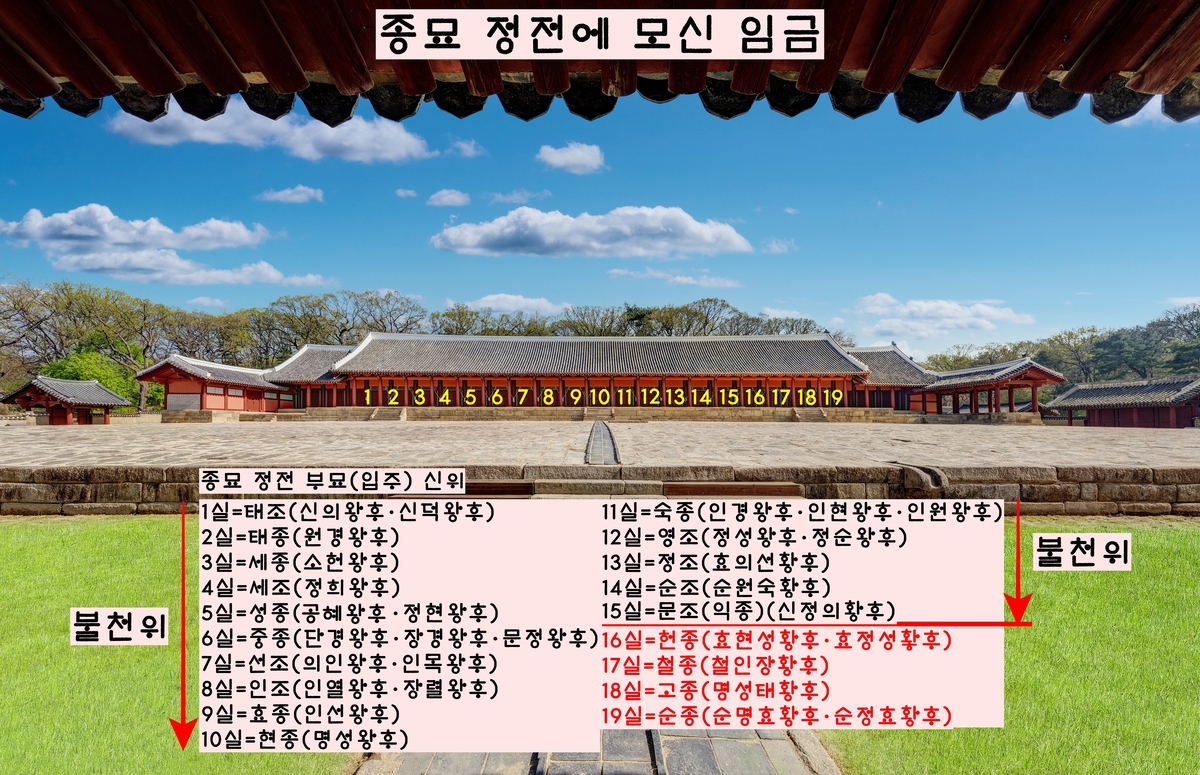 이중 창업군주인 태조를 비롯, 태종·세종·세조·성종·중종·선조·인조·효종·현종·숙종·영조·정조·순조·문조(익종) 등은 ‘불천위’로 종묘 정전에 영구 입주했다. 그런데 정전에는 이 15명 외에도 헌종·철종·고종·순종 등 4명이 남아 있다. 왜냐. 조선왕조가 멸망했기 때문에 이들의 뒤를 잇는 임금이 등장하지 않았기 때문이다. 그래서 이 분들은 영녕전으로 옮겨갈 필요가 없게 됐다. 총 19명이다.