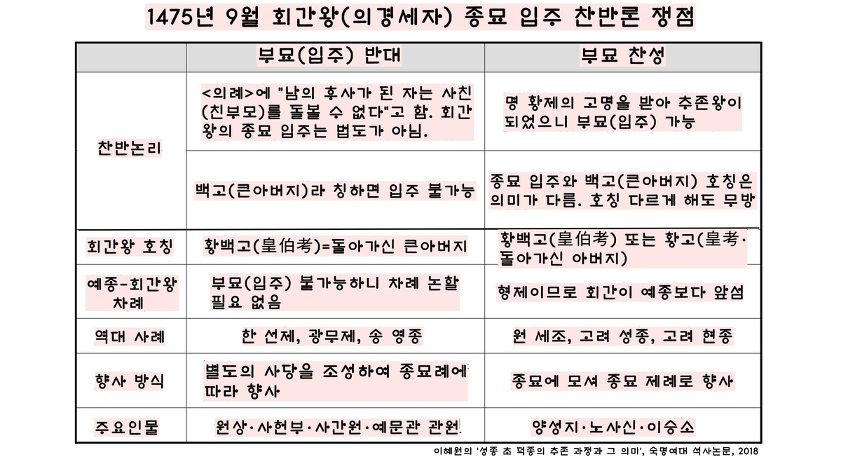 추존왕이 된 것과 ‘종묘 입주’는 별개의 문제라는 것이다. “왕위를 잇는 자는 선왕의 자식이니 사친(친아버지)을 돌볼 수 없다”는 게 옛 법도(<의례>)인데, 그것을 어찌 종묘에서 바꿀 수 있냐는 것이었다. 종묘 합사를 찬성하는 측도 만만치 않았다. 우선 회간왕이 명 황제의 고명을 받은 정식 국왕이 되었으니 무엇이 문제냐는 것이었다. 만약 종묘에 들어간다 해도 해결해야 할 숙제가 남아 있었다.