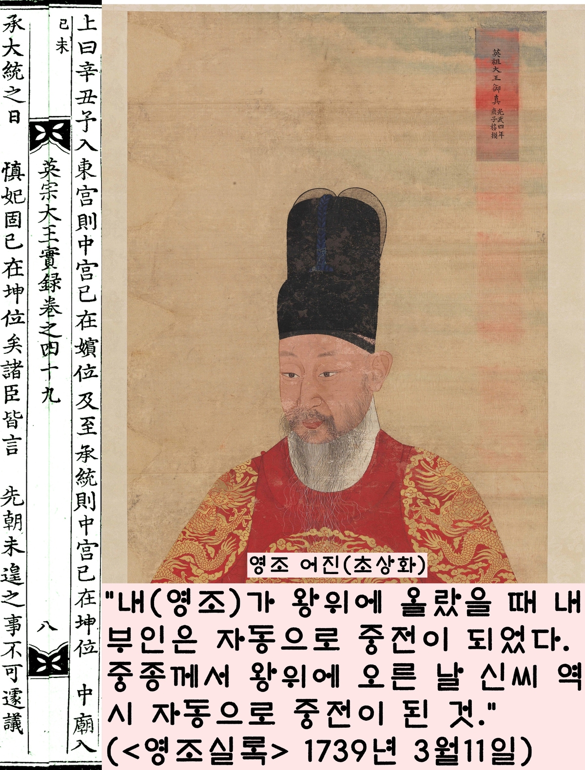 “폐비 신씨가 왕비가 된 적이 없다는 말은 어불성설이다. 날 봐라. 내가 임금이 되었을 때 내 부인은 이미 중전이 됐다. 중종이 왕위에 이은 날 신비(단경왕후) 역시 자동으로 중전이 된 것이다.”(<영조실록> 1739년 3월11일)