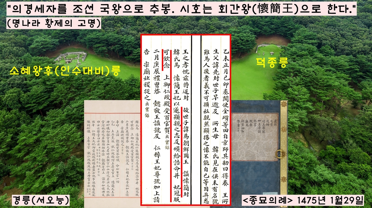 1475년 성종은 명나라 황제의 고명으로 의경세자의 시호(회간왕)를 받는데 성공한다.