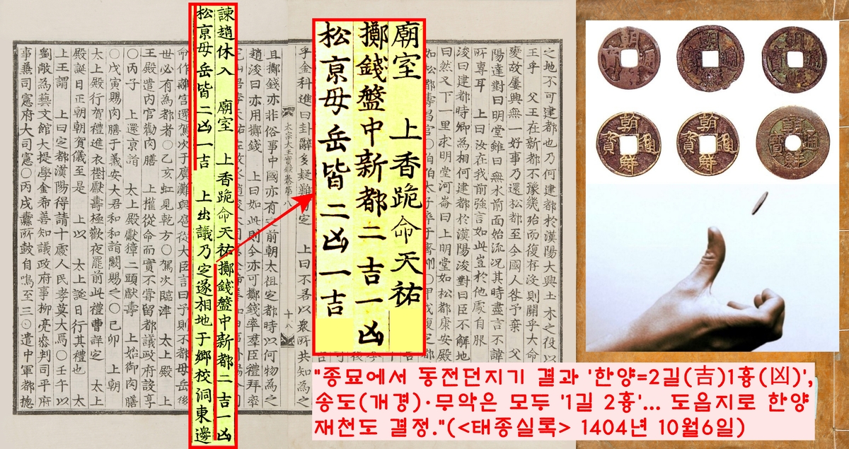도읍지를 정하기 위한 ‘종묘 동전던지기 ’결과 한양은 ‘2길 1흉’, 송도(개경)과 무악은 둘다 ‘1길 2흉’의 괘를 얻었다. 태종은 이 점괘에 따라 새로운 도읍지로 ‘한양’을 최종 낙점했다.