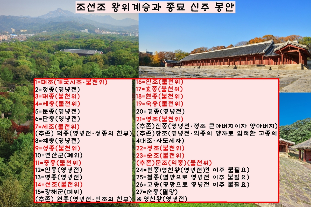 하지만 중종·선조·인조·순조·익종 등은 무슨 자격으로 불천위가 되었을까. 하기야 선조 이후, 즉 조선 후기 들어 불천위가 되지 않고 영녕전으로 이주한 ‘재위 왕’은 경종(1720~1724) 뿐이다. 또 재위기간이 너무 짧거나 억울한 죽임을 당한 정종·단종·예종·인종·경종 등의 심사도 편치않을 듯 싶다.