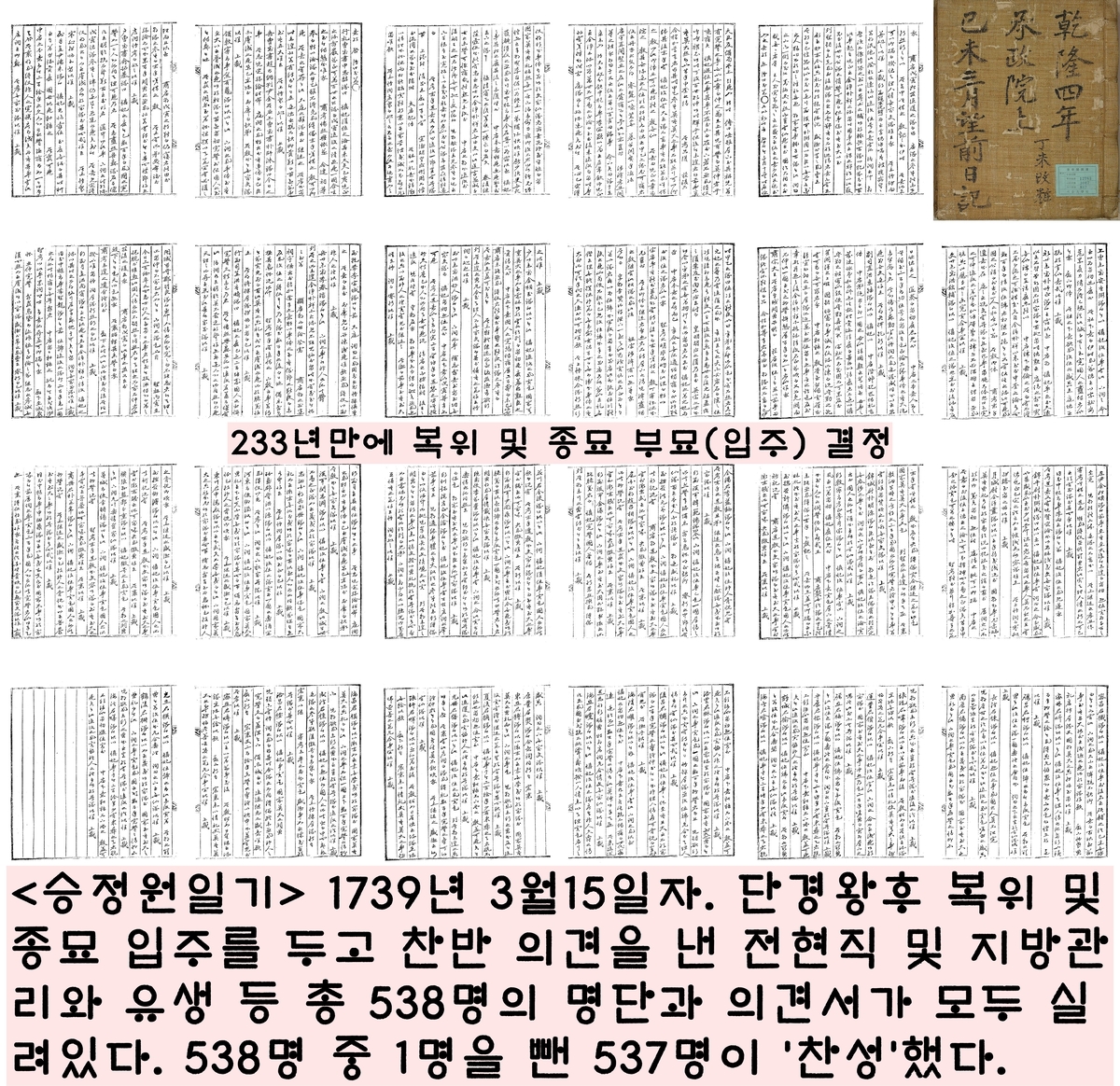 그럼에도 “산씨 복위를 위한 중론을 모으라”는 영조이 명에 따라 종친 및 문무백관과, 지방 관리 및 유생 등 538명이 신씨의 복위를 두고 찬반토론을 벌였다. 이중 1명을 제외한 537명이 ‘신씨 복위’에 찬성표를 던졌다. <승정원일기> 1739년 3월15일자는 538명의 의견서를 모두 기록했다. 철저한 기록정신이다.