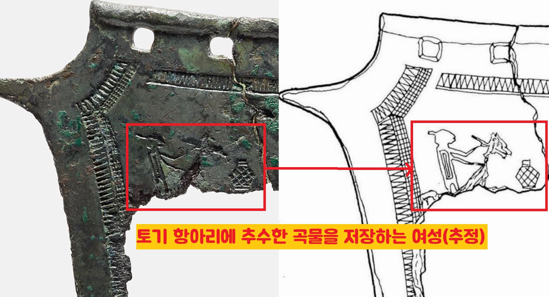 그렇다면 ‘나체’ 부분만 빼고 정리해볼까요. 청동기에 ‘출연’한 3명 중 두 사람은 밭을 갈고 있고(한사람은 나체로 따비질, 다른 한사람은 괭이질), 왼편의 여성은 추수한 곡식을 항아리에 담고 있다는 겁니다.