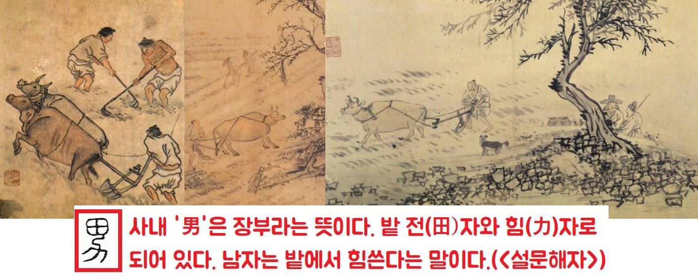 남성이 수렵생활을 벗어난 인류가 정착해서 가정을 꾸리고, 농사를 짓고, 마을을 지키는 공동체의 수호자로서 부각됐다는 겁니다. 한자인 ‘사내 남(男)’자에 그러한 인식이 녹아있답니다. ‘남(男)’자는 ‘밭 전(田) 자 밑에 힘 력(力)가 있잖습니까.