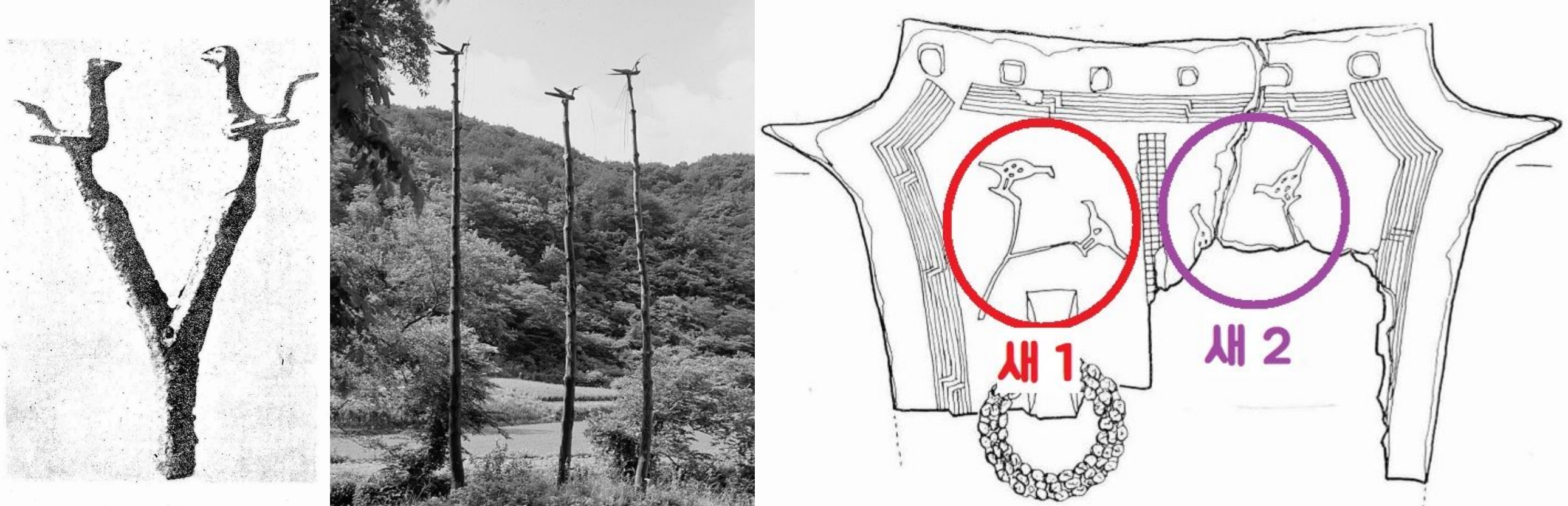 Y자 형의 무늬 끝에 몸에 반점이 찍힌 두마리의 새가 마주 보고 앉아 있었습니다. 나뭇가지에 앉은 새를 표현한 것이 틀림없었습니다. 한병삼 연구관은 대번에 ‘솟대’를 떠올렸습니다. 솟대가 무엇입니까. 20~30척의 장대 위에 가로목을 걸치고 그 위에 나무새 혹은 돌새를 1~3마리 올려놓은 신간(神竿)이죠. 신간은 ‘하늘에서 신령이 하강하는 통로로 인식되는 나무’를 뜻합니다.