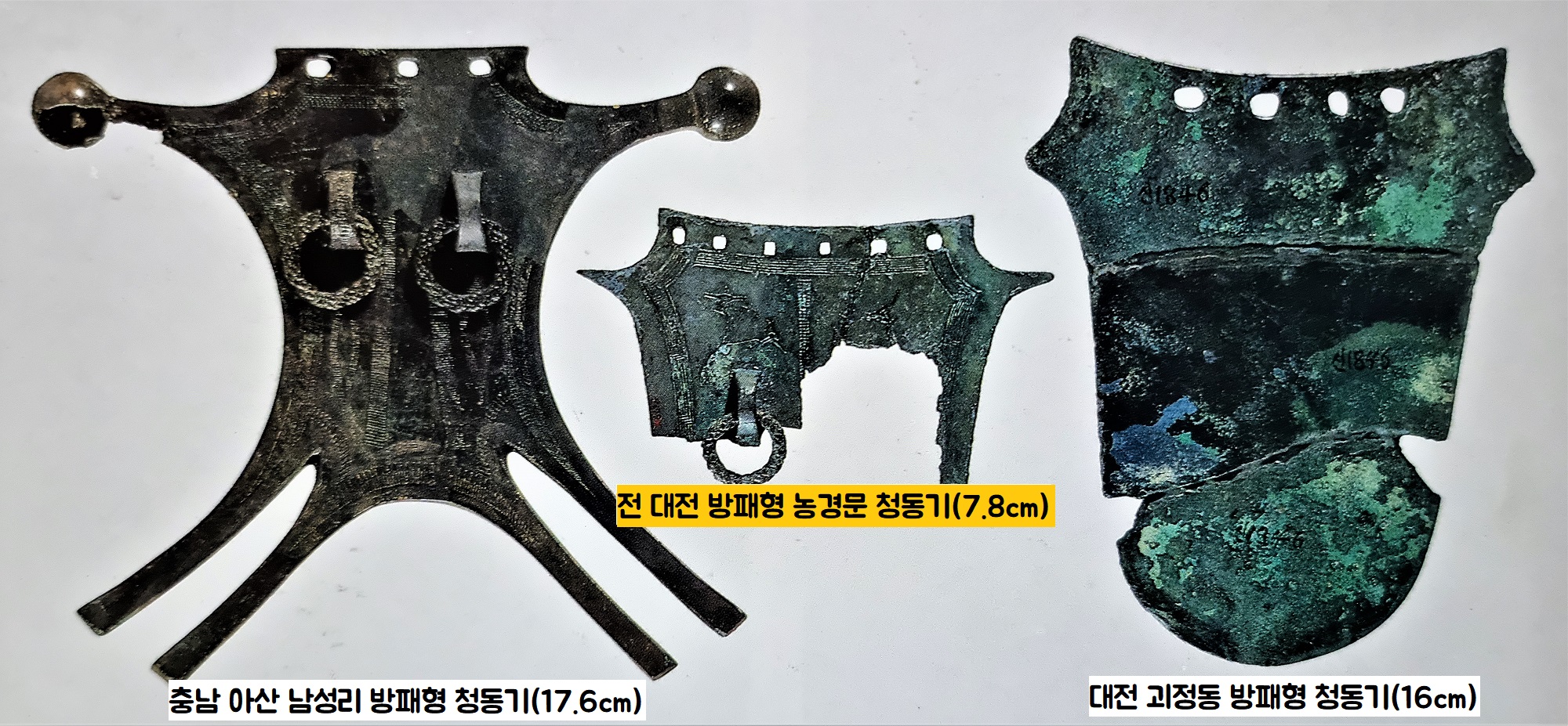문양이나 제작기법 상으로는 거친 느낌의 괴정동 방패가 가장 오래된 기원전 5~4세기 정도로 보이고요. 새끼줄 모양의 고리 등 정교한 무늬 새기기가 돋보이는 농경문 및 아산 출토품은 그보다 약간 늦은 기원전 4세기 무렵으로 추정된답니다.