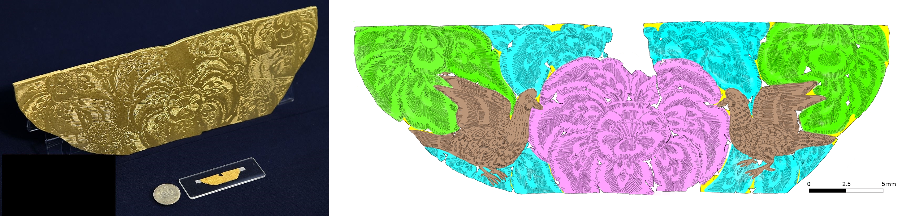경주 동궁 및 월지 유적에서 인부가 발견한 0.03mm의 금박 화조도. 정교한 무늬가 일품이다.