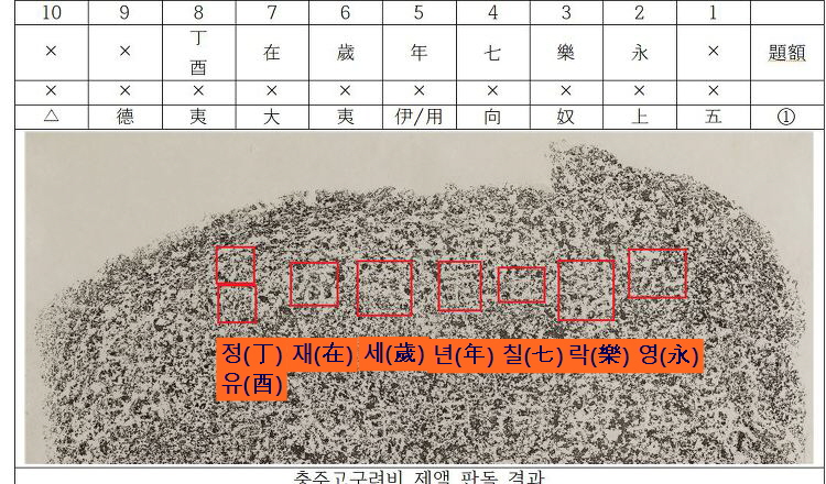 그런데 연구에 참여한 고광의 동북아역사재단 연구위원이 흥미로운 판독결과를 발표합니다. 즉 연구자들이 합의하지 못한 글자를 8자 읽었다는 논문을 발표한 겁니다. 즉 기로쓰기 형태의 비석제목에 ‘영락7년세재정유(永樂七年歲在丁酉)’라는 글자가 보였다는 겁니다. 즉 비석은 ‘영락 7년(광개토대왕· 397년)에 일어난 사건’의 기록이라는 겁니다.