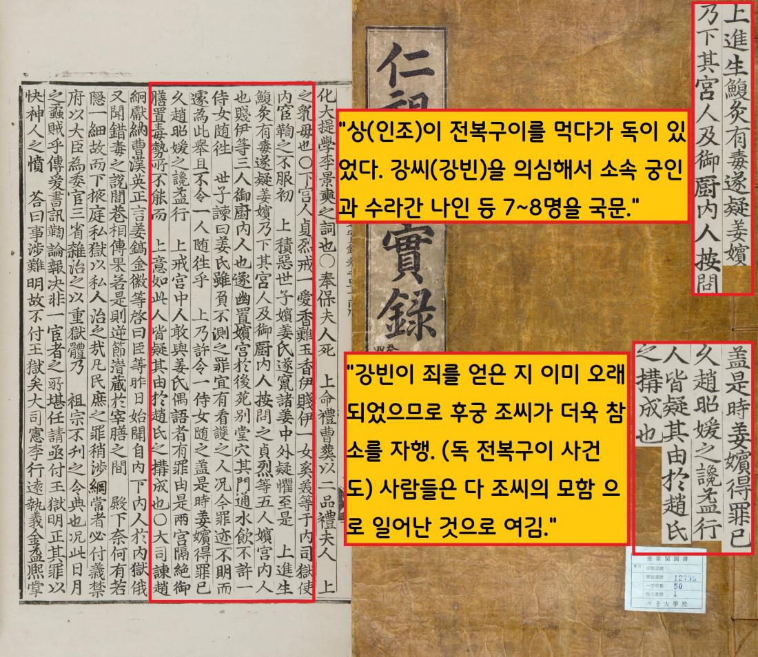 “주상이 전복구이를 드시다가 독이 있었다. 강씨(강빈)을 의심해서 소속 궁인명과 수라간 나인 등 7~8명을 국문했다”는 것이다. 하지만 이 7~8명은 혹독한 고문을 당했지만 끝내 자복하지 않았다. 이들 중 강빈의 가장 신임한 궁녀 두사람은 압슬형(사금파리를 무릎 아래 깔고 짓이김)과 낙형(불에 달군 인두로 지짐) 끝에 사망했다.