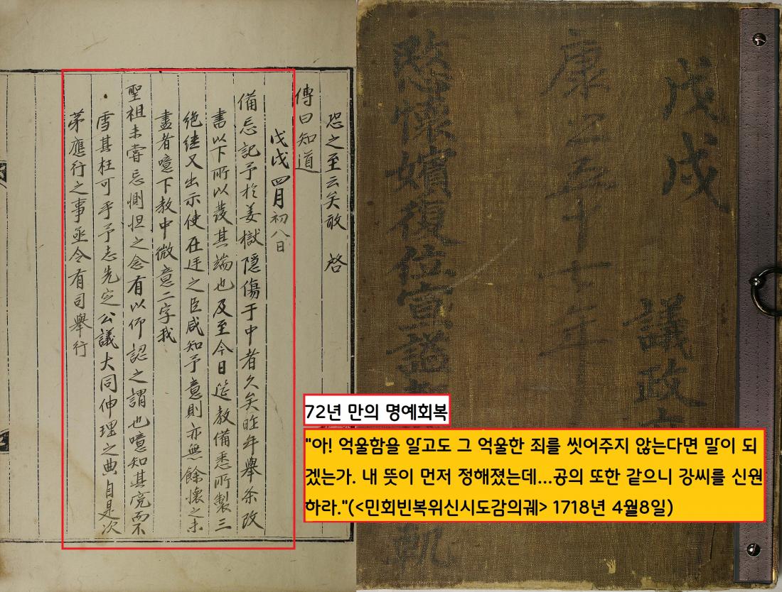 급기야 72년만인 1718년(숙종 44) 3월25일 숙종은 “평소 강빈의 옥사에 마음으로 항상 측은한 마음을 갖고 있다”(<민회빈복위선시도감의궤>)는 소회를 밝혔다. 숙종은 이어 4월8일 비망기를 내려 “억울함을 알고도 그 억울한 죄를 씻어주지 않으면 말이 되겠느냐”면서 강씨의 명예회복을 명했다. 숙종은 ‘민회빈’의 시호를 얻은 강빈의 복위·선시(시호를 내림)를 알리는 교서를 발표했다. 물론 교서에서는 “민회빈이 죽은 것은 흉악한 자들의 참소와 이간질 때문”(<숙종실록> 1718년 5월22일)이라고 천명했다. 끝까지 ‘악의 축’인 인조의 책임으로 돌리지 않았던 것이다.