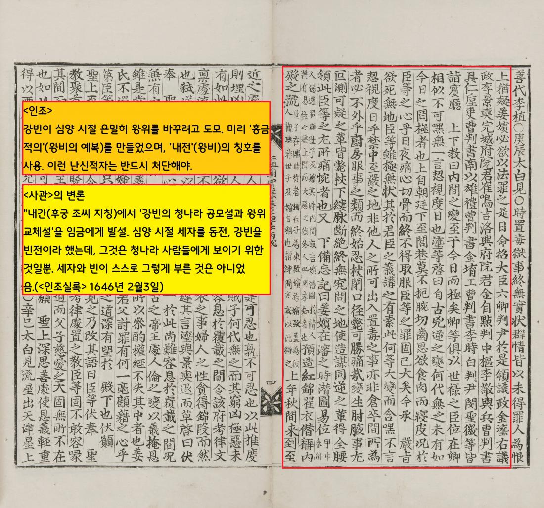 즉 “강빈이 심양 시절 은밀히 왕위를 바꾸려고 도모했고, 미리 ‘홍금 적의’(왕비의 예복)를 만들었으며, ‘내전’(왕비)의 칭호를 사용했다”(<인조실록> 1646년 2월3일)는 것이었다.