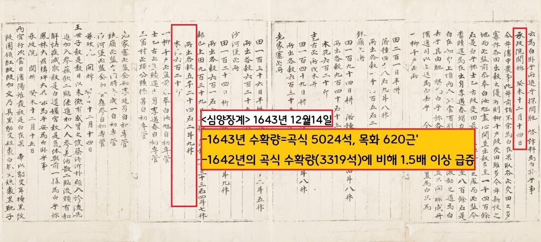 농사 첫해(1642) 3319석이었던 수확량은 2년차인 1643년 5024석 및 목화 620근으로 대폭 늘었다.