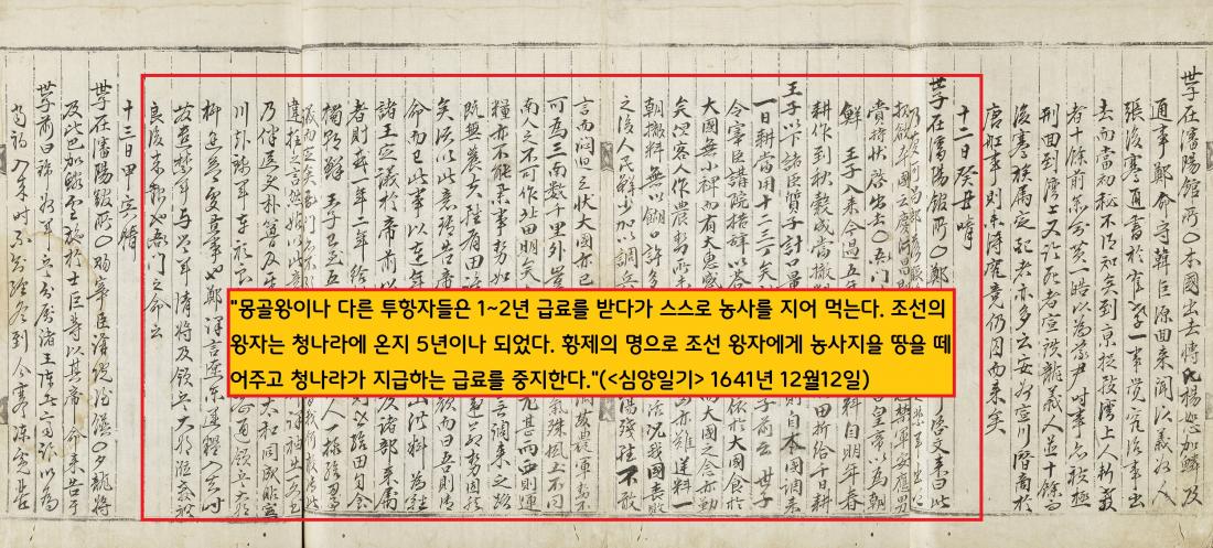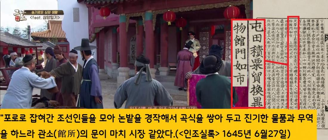 “세자가…포로로 잡혀간 조선 사람들을 모아 둔전(관소 소유의 논밭)을 경작해서 곡식을 쌓아두고 그것으로 진기한 물품과 무역했다. 심양관이 문전성시를 이뤘다.”(<인조실록> 1645년 6월27일)