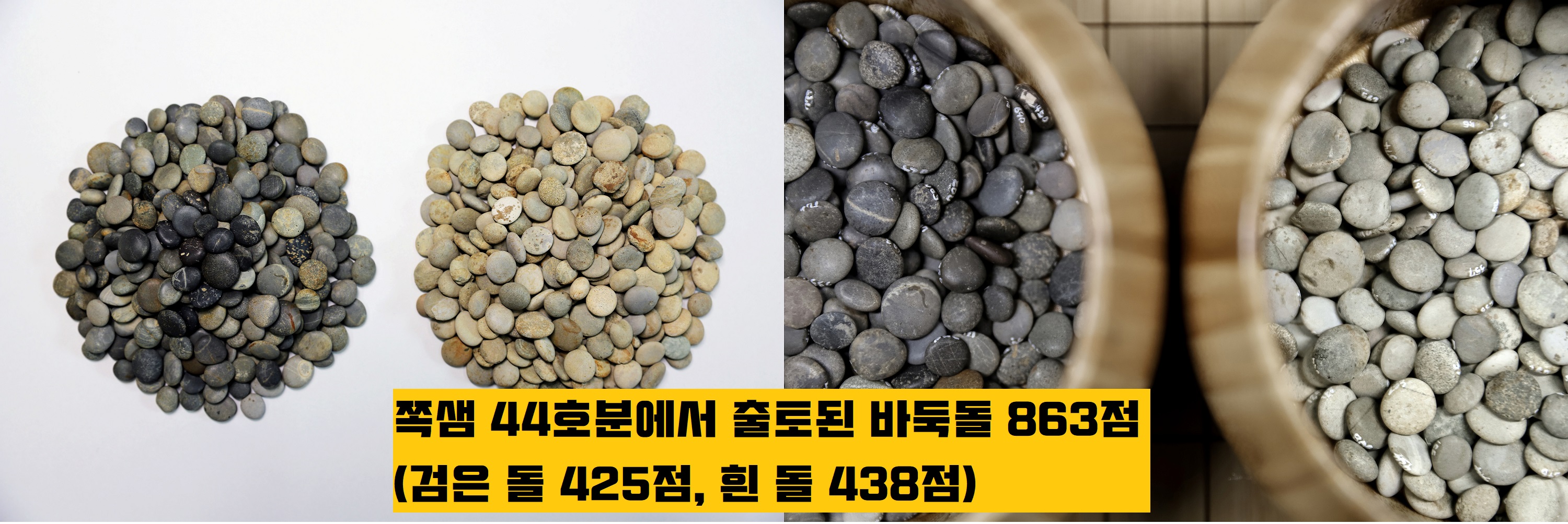 색깔은 크게 흑색·백색·흑색 등으로 나눌 수는 있는데요. 분류해보니 검은 돌이 425점, 흰 돌이 438점으로 띠를 이루고 있었습니다. 바둑돌의 크기는 지름 1.0~2㎝, 두께 0.5㎝ 내외였으며, 평균 1.5㎝ 정도였습니다.