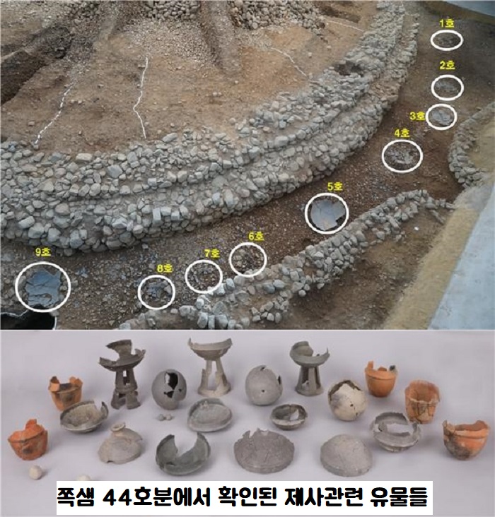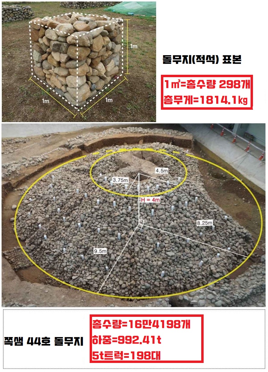 우선 쪽샘 44호의 봉분의 규모는 중형급이지만 돌무지의 규모(16~19m)는 금관총(20~22m)·서봉총(16~20m) 등 왕릉으로 추정되는 비슷한 시기의 고분과 맞먹을 정도거든요. 쌓인 돌무지의 무게가 5t 트럭 198대분(992.41t)에 이르거든요.
