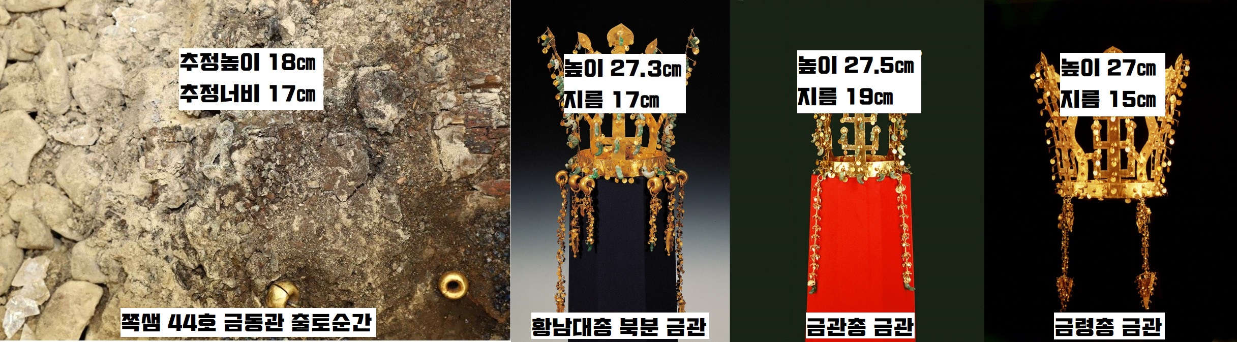 무엇보다 이 쪽샘 44호분에서 쏟아져 나온 유물의 특징은 ‘아담 사이즈’라는 데 있는데요. 노출된 44호분 금동관의 추정 높이(약 18㎝)는 황남대총 북분(높이 27.3㎝)과 금관총(27.5㎝) 및 금령총(27㎝) 등에 비해 상당히 작은 편이거든요. 관테와 세움장식 역시 상대적으로 작구요. 출토된 허리띠의 좌우 폭(34㎝) 역시도 작은 편에 속합니다.
