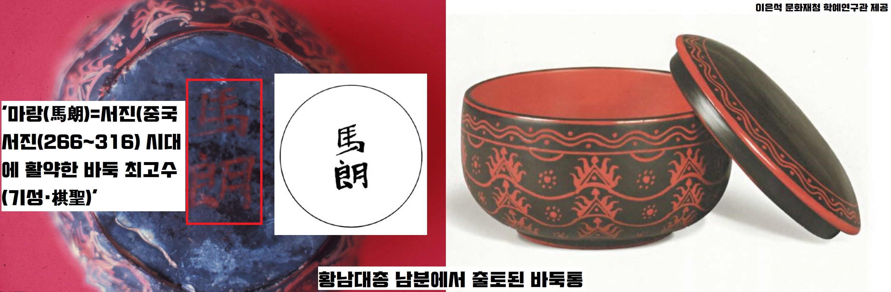 관련해서 나중에 밝혀진 중요한 사실이 있는데요. 황남대총 남분에서 출토된 칠기의 바닥에 ‘마랑(馬朗)’ 명문이 보였는데요. 이 ‘마랑’은 중국 서진(266~316) 시대에 활약한 바둑 최고수인 ‘기성(棋聖)’의 칭호를 얻은 인물이었음이 뒤늦게 밝혀졌습니다. 당대 바둑책을 29권이나 편찬할 정도로 이름을 떨친 인물이죠. 그렇다면 황남대총 남분에서 출토된 ‘마랑’명 칠기는 불세출의 기성인 ‘마랑’의 사인이 새겨진 바둑돌통이라 할 수 있습니다.