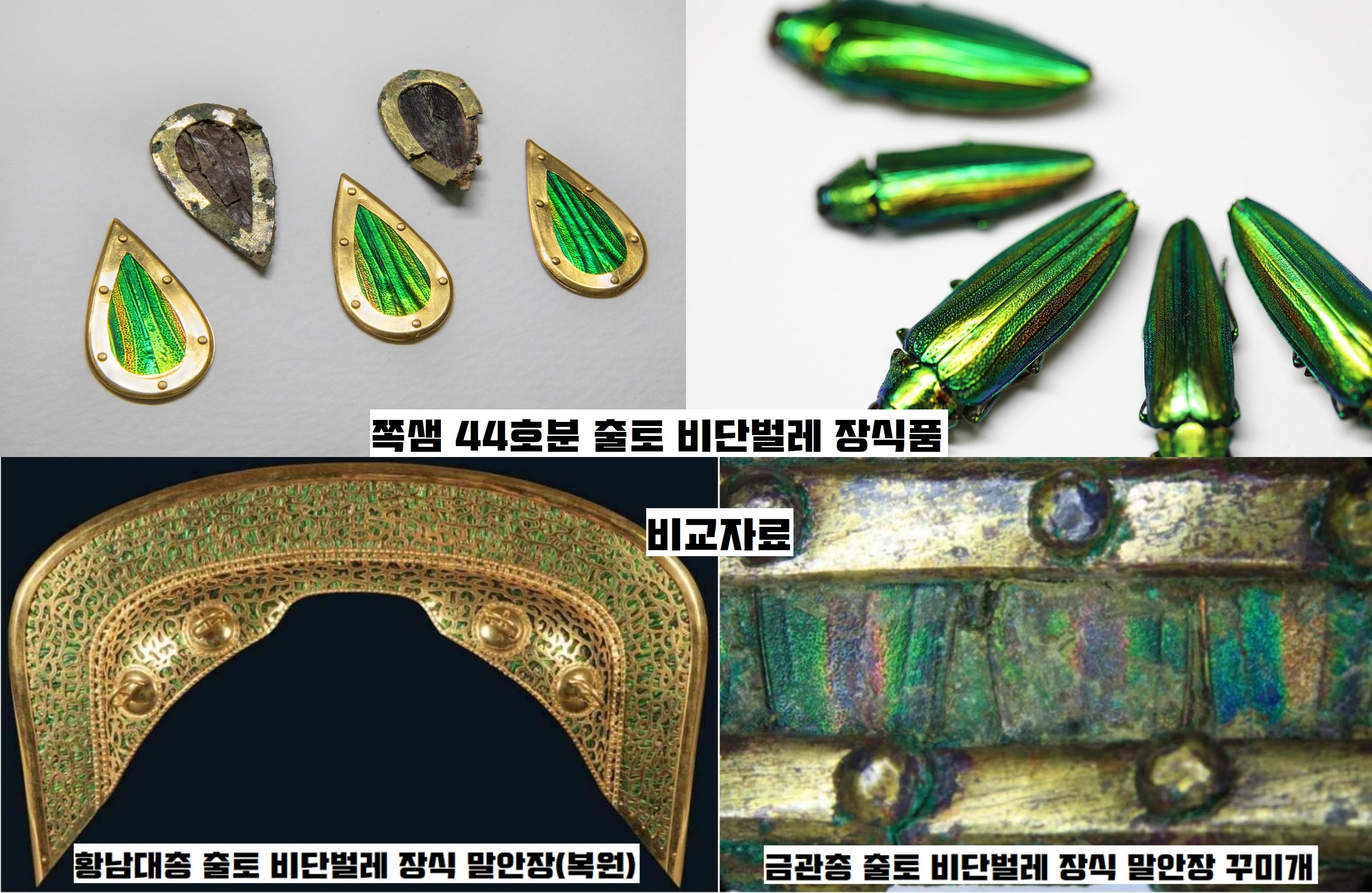 또 ‘가슴걸이’는 남색 유리구슬과 달개가 달린 금구슬, 은구슬을 4줄로 엮어 곱은옥을 매달았는데요. 이런 형태는 황남대총이나 천마총 같은 최상위 계층 무덤에서만 확인된 디자인이라는 겁니다. 또한 영롱한 녹색(또는 금록색)의 비단벌레 날개로 장식한 하트 문양의 펜던트도 주목되는 데요. 비단벌레의 날개 2매를 겹쳐 물방울 모양으로 만들고, 앞뒤판 둘레를 금동판으로 고정하여 만든 거죠. 이 비단벌레 장식은 황남대총 남분, 금관총, 계림로 14호 등 최상급 무덤에서만 출토된 바 있거든요.