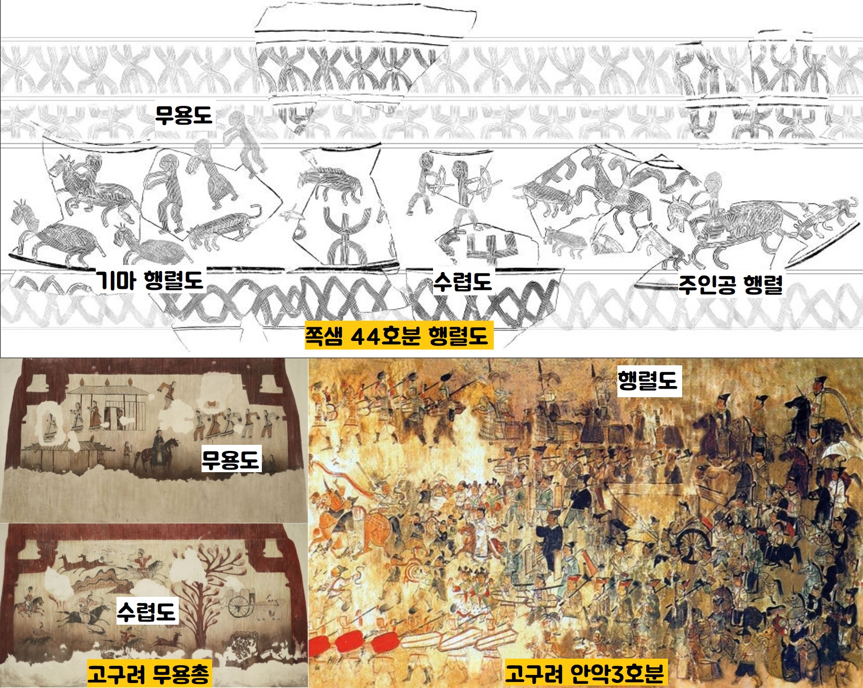 이중 말 타고, 춤추는 사람과 사슴·맷돼지·말·개 등을 기하학 문양과 함께 새긴 토기는 안악 3호분(4세기 중반)과 무용총(5세기 전반) 등 고구려 행렬·수렵도의 영향을 받은 것으로 해석되었습니다. 당연히 화제를 뿌렸죠.