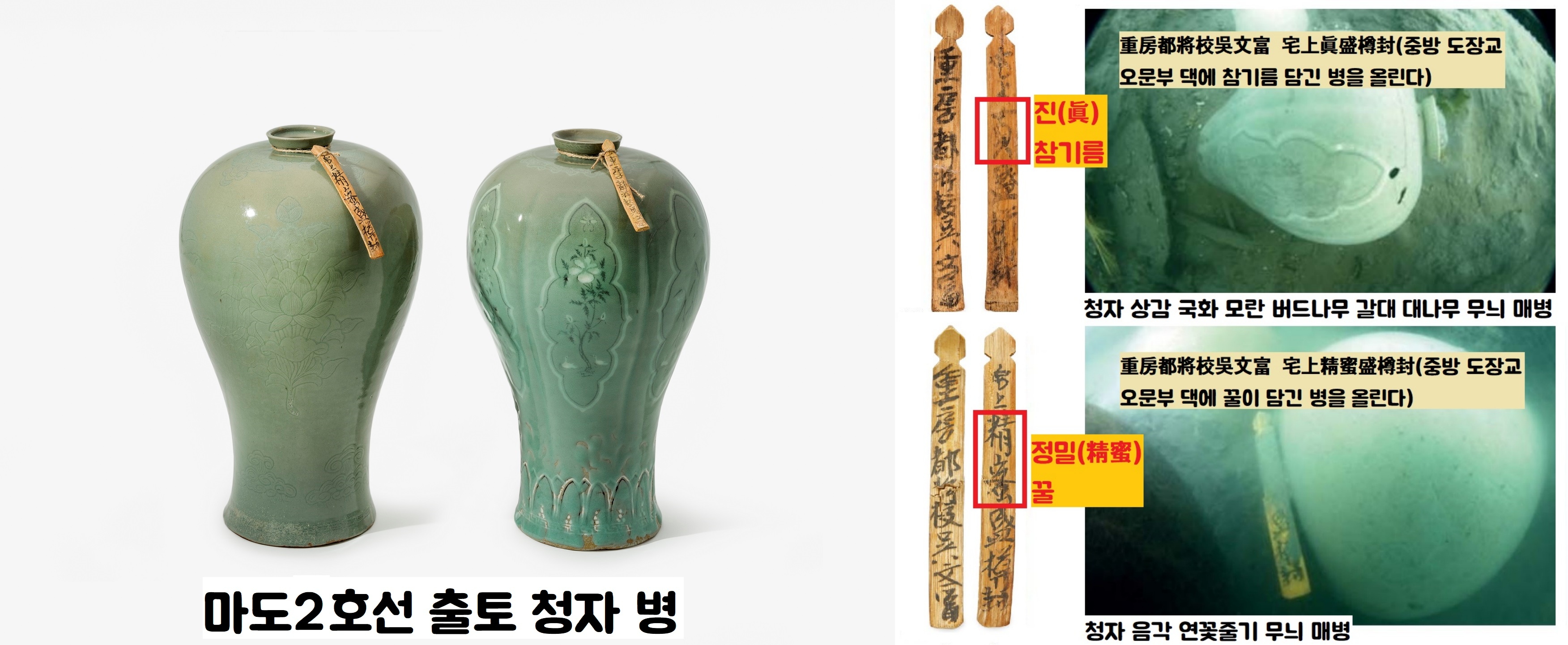 두 점 모두 ‘중방(고려 무신정권의 최고 의결기구) 소속 무관(도장교·정 8품) 오문부에게 보낸 참기름과 꿀’이었음을 밝혔습니다. ‘모란~’ 매병에는 ‘참기름(眞)’자가, ‘연꽃가지~’ 매병에는 ‘꿀(精蜜)’자가 들어있었거든요. 명문 대나무 조각은 지금의 택배 물품표였던 겁니다. 놀라운 일이죠. 이렇게 아름다운 명품 청자를 생활용기로 썼다니 말입니다.