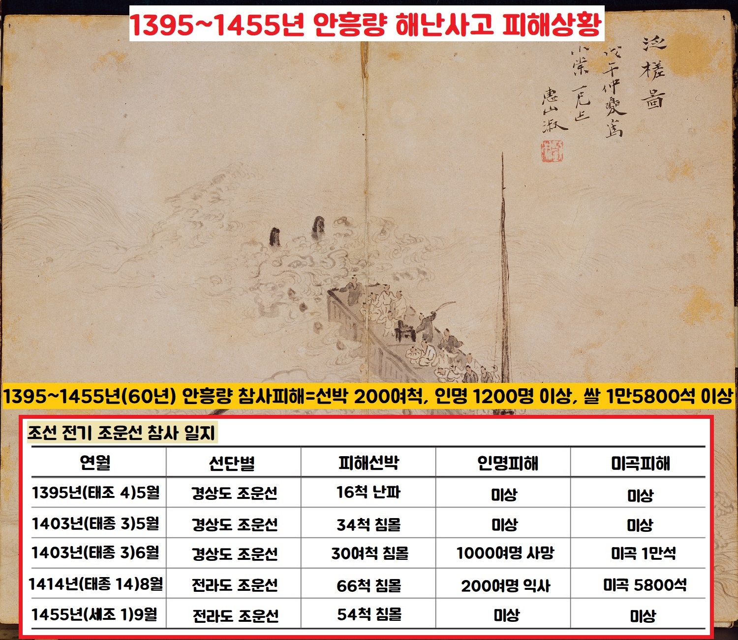 1395~1455년 사이 60년간 안흥량에서 파선 및 침몰된 선박이 200여척, 인명피해 1200명, 미곡손실 1만5800석에 달했습니다. 이로써 엄청난 인명피해가 발생함은 물론 국가재정 또한 고갈되는 이중고를 겪게 되었습니다.
