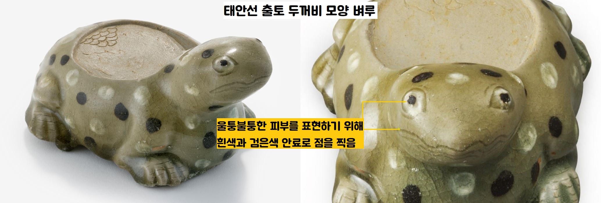 그 중의 백미는 사자머리 모양 향로 2점(보물)이었습니다. 두 점 모두 날카로운 이빨과 매섭게 뜬 눈이 예사롭지 않지만 마냥 무서워할 수 없는 해학적인 모습입니다. 또 ‘퇴화문(물감을 두껍게 칠하는 무늬) 두꺼비형 벼루’도 올라왔는데요. 금방이라도 뛰어오를 듯 다리를 웅크리고 고개를 든 모습이 간결하면서도 힘찬 기운이 느껴지죠.