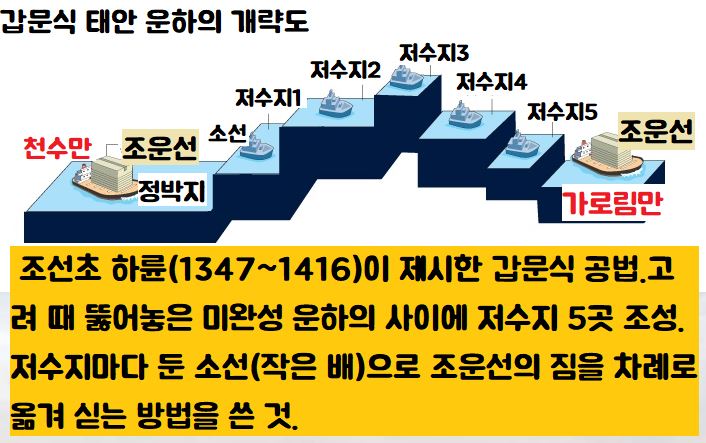 그 사이 높낮이에 따라 5개의 저수지를 만들고, 저수지마다 소선(작은 배)를 둔 뒤 포구에 도착한 조운선의 짐을 차례로 옮겨 싣는 방법을 쓴다는 겁니다.(1413년) 그러나 이 공법 또한 실패로 돌아갑니다.