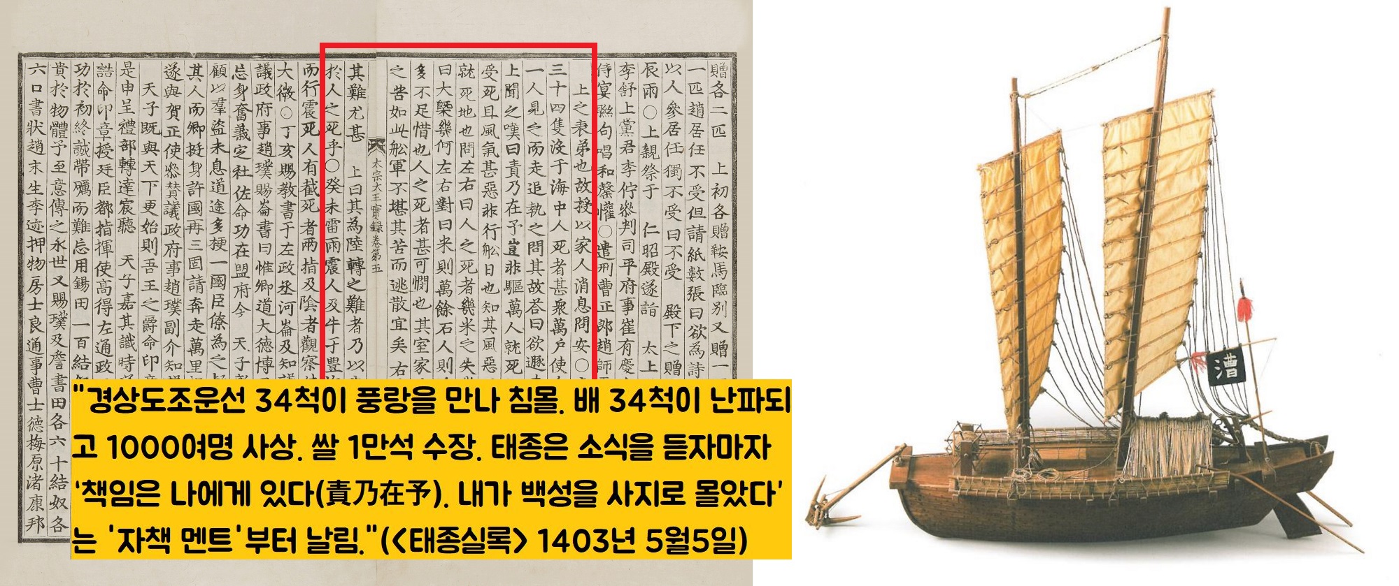 태종이 “쌀은 아깝지 않지만 사람 죽은 것이 대단히 불쌍하다”면서 “그 부모와 처자의 마음이 어떠하겠느냐”고 애통해합니다. 또 이때 난파된 조운선의 선원이 도망하다가 붙잡힌 뒤 “운항이 너무 괴로워서 이 참에 다른 일을 찾고 싶다”고 진술했는데요. 이때 태종의 반응이 예사롭지 않습니다.